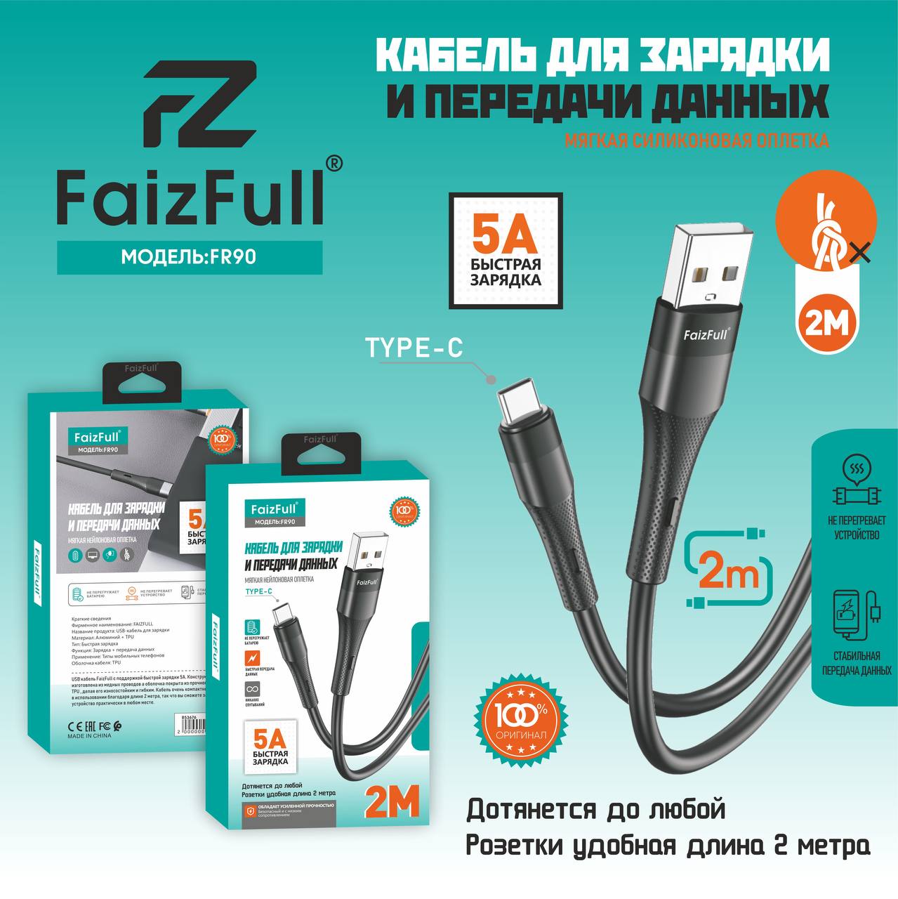 Кабель USB - Type-C FaizFull FR90 пищевой силикон белый круглый 5A 2 м.