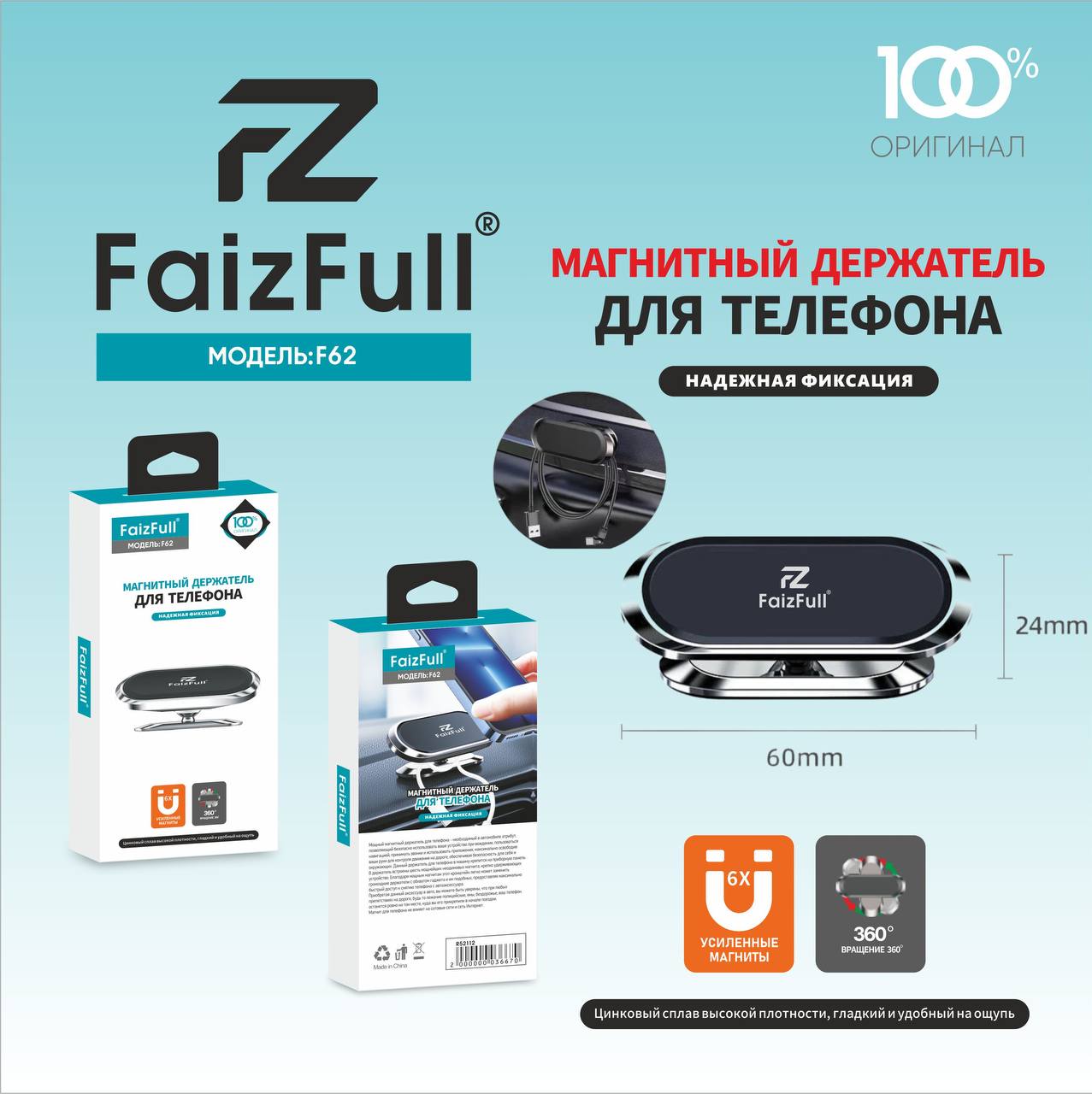 Держатeль для телефона автомобильный FaizFull F62 магнитный на панель серебро
