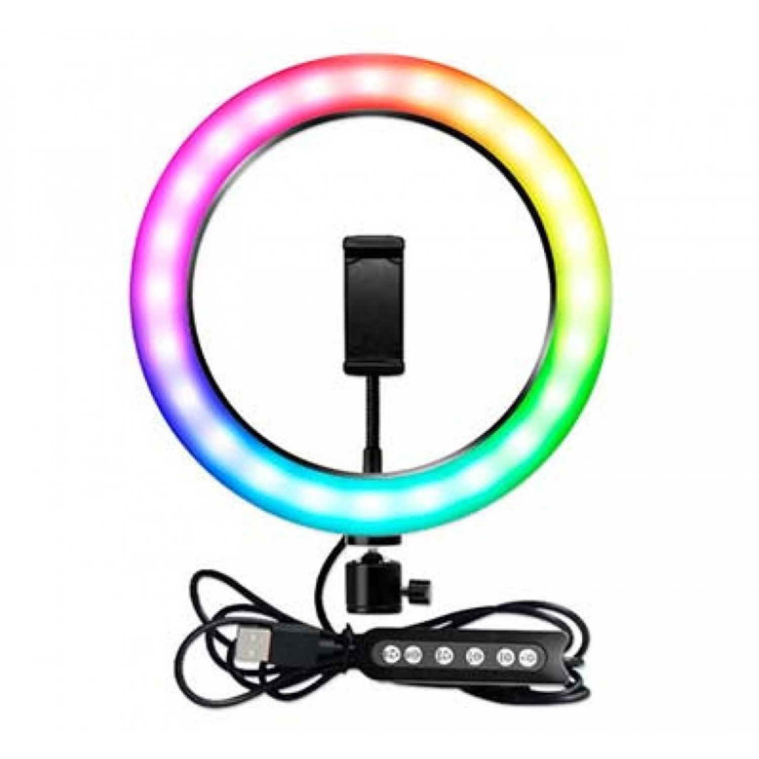 Внешний диаметр: 26см Внутренний диаметр:20м Источник света: Led SMD Материал: ABS пластик Питание: при помощи USB от блока питания 5V/2A Плавная регулировка яркости Управление: при помощи пульта, расположенного на кабеле питания. Режим цвета: 3 основных режима цвета (холодный, теплый, смешанный), 7 дополнительных цветов (красный, оранжевый, желтый, зеленый, голубой, синий, фиолетовый) Комплектация: Селфи-кольцо, переходник для крепления кольца к штативу, держатель для телефона