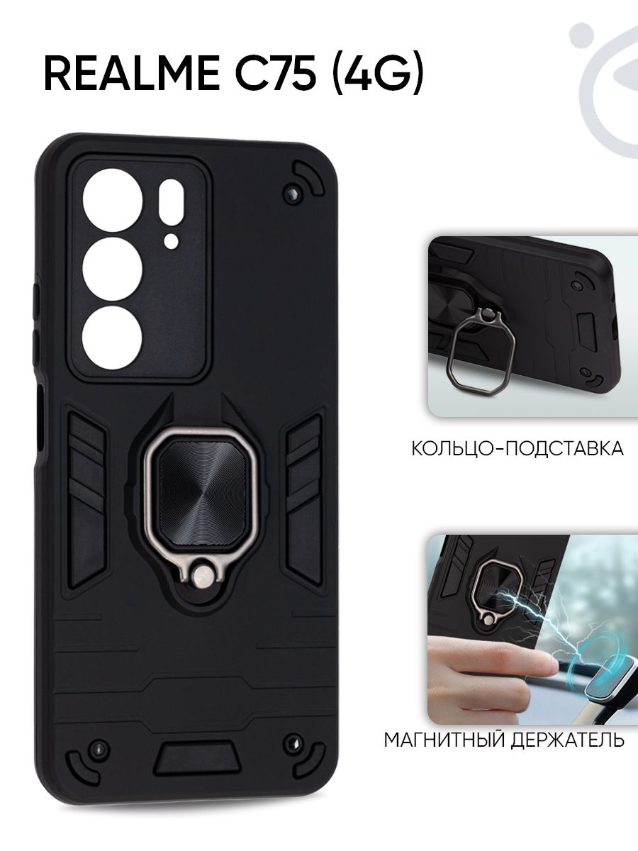 Накладка Realme C75 черный силикон+пластик ZB Противоударный кольцо-подставка + магнитный...