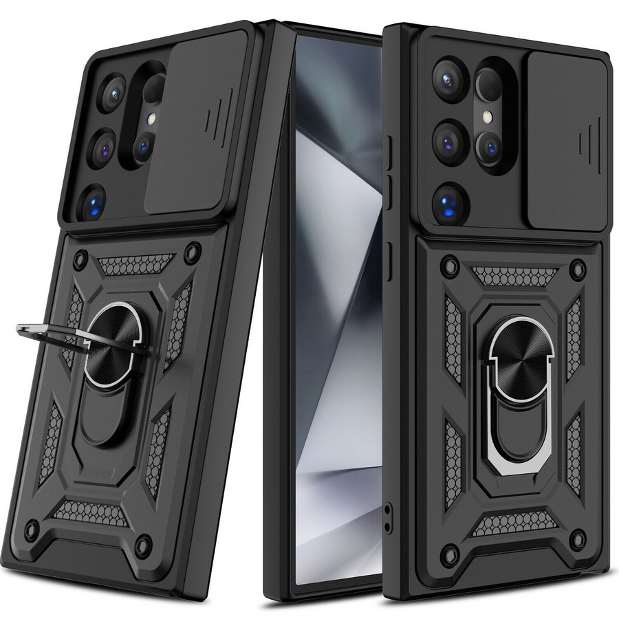 Накладка Samsung S25 Ultra черный силикон+пластик Armor Case Противоударный кольцо-подставка + магнитный держатель