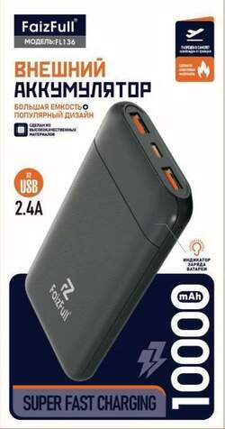 Внешний аккумулятор 10000 mAh FaizFull FL136 2USB+Type-C черный LED индикатор