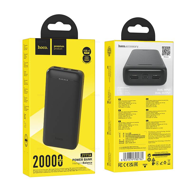 Внешний аккумулятор 20000 mAh HOCO J111A 2USB+Type-C черный LED индикатор