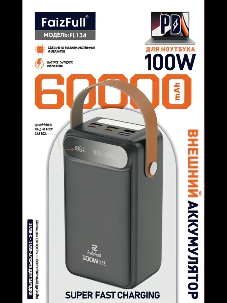 Внешний аккумулятор 60000 mAh FaizFull FL134 4USB/Type-C/Lightning черный LED дисплей PD+QC