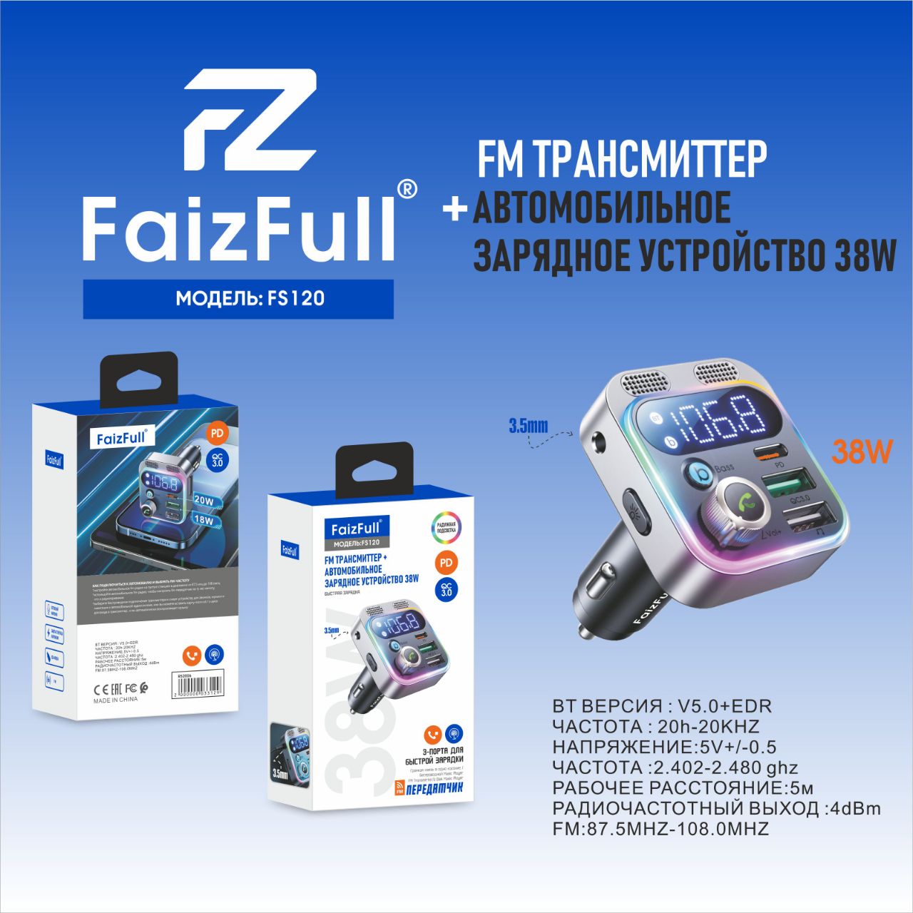 FM-трансмиттер FaizFull FS120 Bluetooth, 2*USB/Type-C 38W