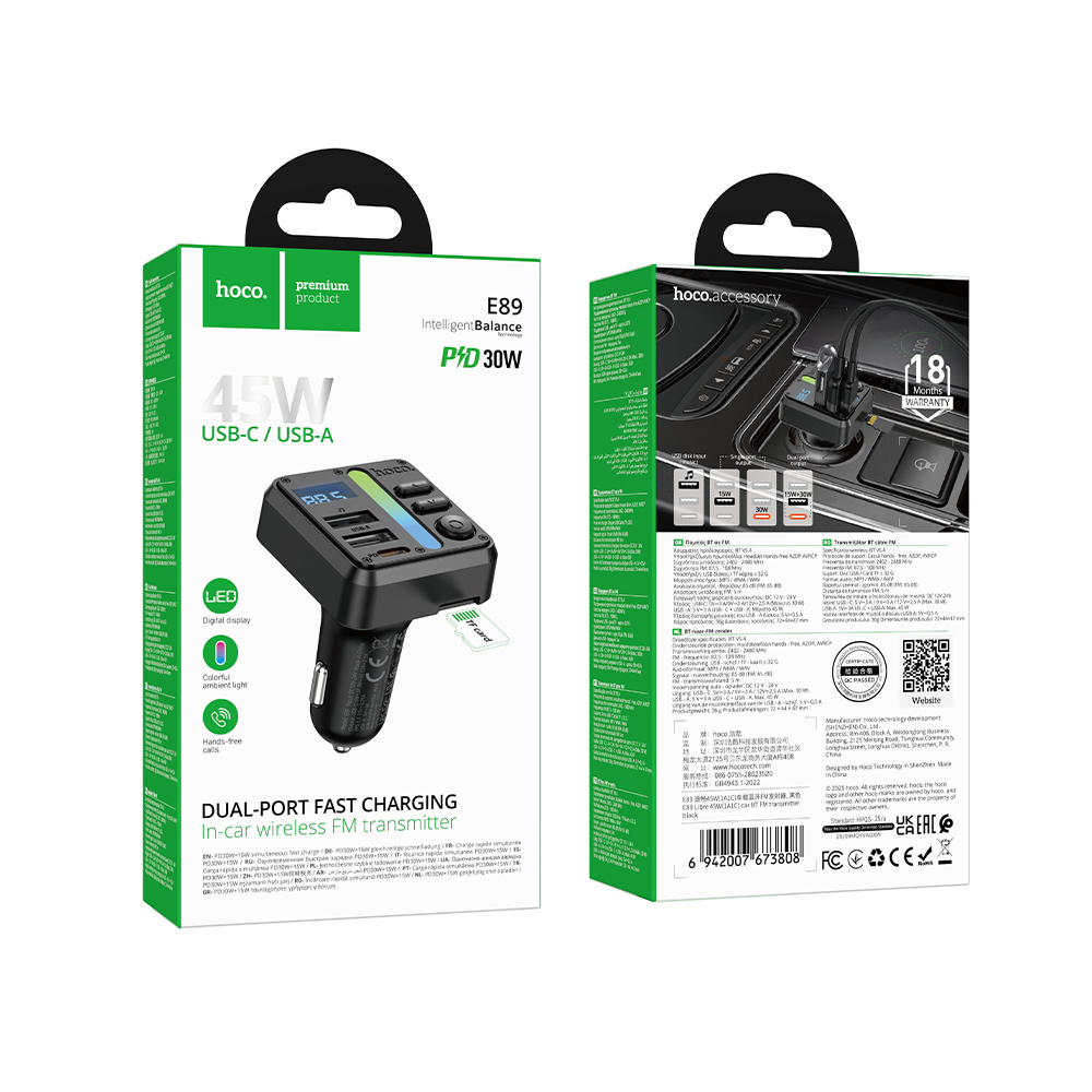 FM-трансмиттер HOCO E89 Bluetooth, 2*USB/TF черный 45Вт, PD30W