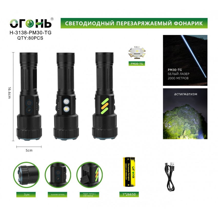 Фонарик ручной No brand H-3138-PM30 1 LED 1*18650