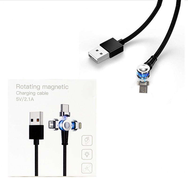 Кабель USB - micro USB No brand 180° силикон черный круглый 2.1A 1 м. магнитный