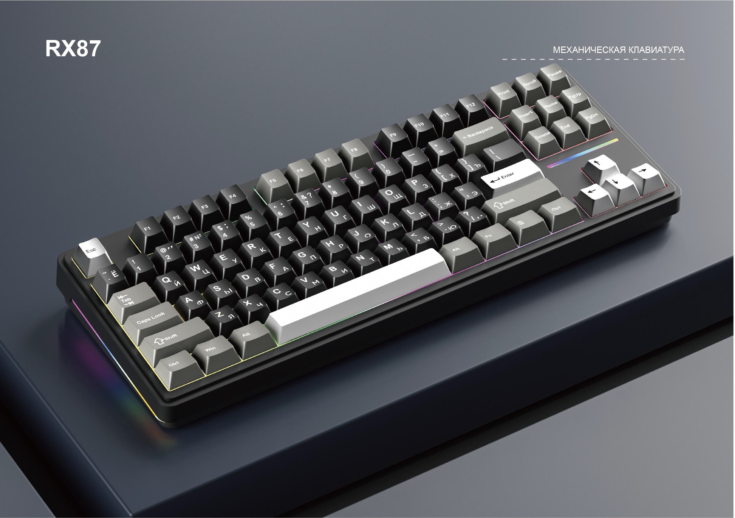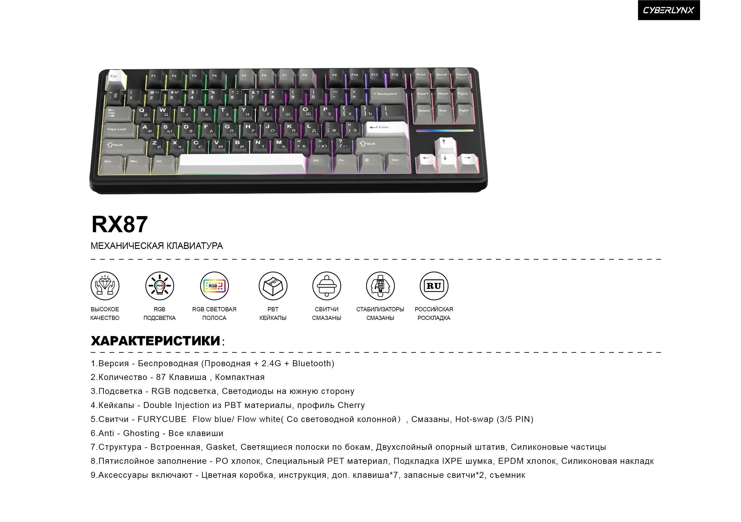 Клавиатура CYBERLYNX RX87 PRO Bluetooth+2,4G механика, LED подсветка черно-серый