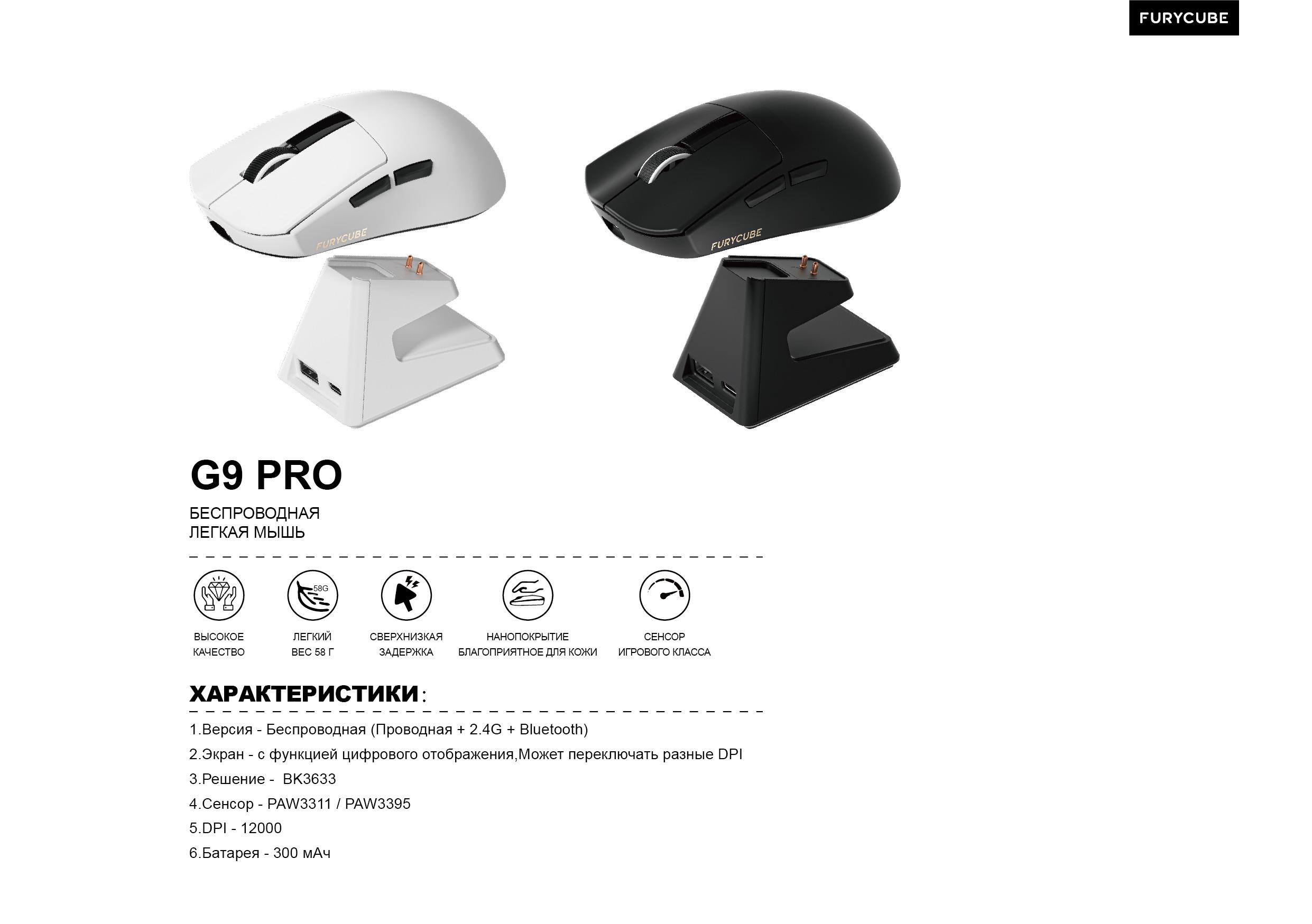 Мышь FURYCUBE G9 Bluetooth+2,4G PixArt 3395 АКБ 12000 dpi белый + док станция