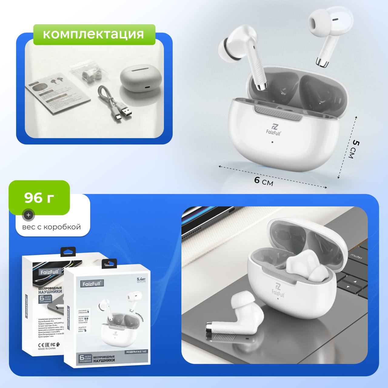 Наушники FaizFull 162 вакуумные, Bluetooth, белый