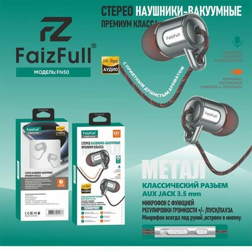 Наушники FaizFull FN50 вакуумные, проводные, Jack 3.5, серый