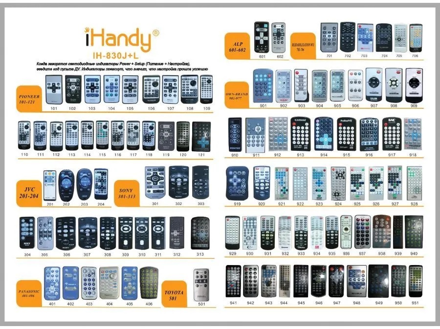 Заменяет пульты для автомагнитол следующих производителей: пульты для автомагнитол PIONEER пульты для автомагнитол JVC пульты для автомагнитол SONY пульты для автомагнитол PANASONIC пульты для автомагнитол ALPINE пульты для автомагнитол TOYOTA пульты для автомагнитол REHABILITATION WU пульты для автомагнитол OWN-BRAND (для большинства китайских автомагнитол)