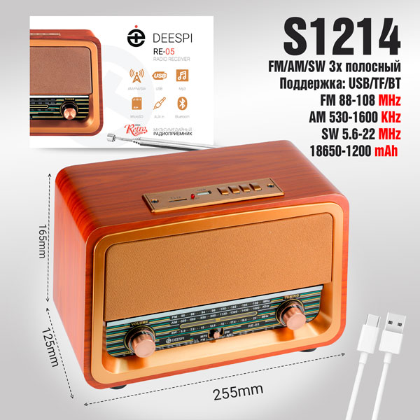 Радиоприемник Deespi RE-05 аналоговый FM, AM USB/microSD/Bluetooth питание от АКБ, от сети,