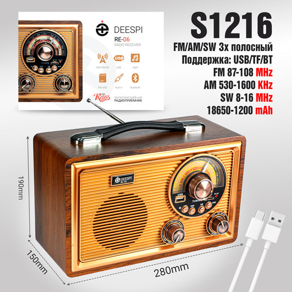 Радиоприемник Deespi RE-06BT аналоговый FM, AM USB/microSD питание от АКБ, от сети,