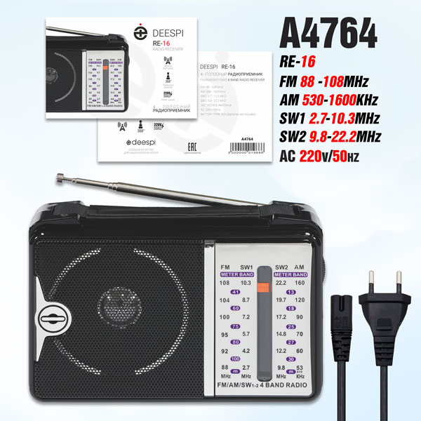 Радиоприемник Deespi RE-16/606 аналоговый FM, AM USB/microSD питание от АКБ, от сети,