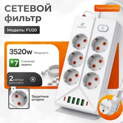 Сетевой фильтр FaizFull FU20 белый 2 м 6 розеток + 4 USB + 2 TYPE-C 3520W 16A