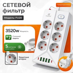 Сетевой фильтр FaizFull FU20 белый 5 м 6 розеток + 4 USB + 2 TYPE-C 3520W 16A