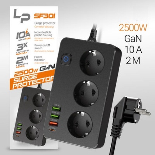 Сетевой фильтр Live-Power SF301 черный 2 м 3 розетки + 3 USB + 1 TYPE-C 2500W 10A